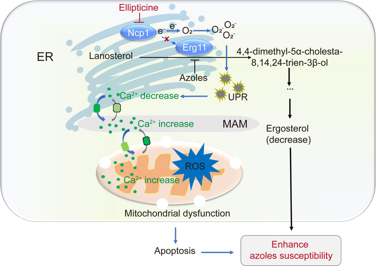 2025年8月1日,同济大学医学院姜远英教授及鹿辉副研究员作为共同通讯作者,同济大学医学院博士研究生李婉倩作为第一作者,在Nature communications发表题为“Impairing the interaction between Erg11 and cytochrome P450 reductase Ncp1 enhances azoles’ antifungal activities”的研究论文。研究发现发现Erg11蛋白的V234、F235和L238三个氨基酸对其与Ncp1的相互作用至关重要,而Ncp1-Erg11的结合对唑类药物的抗真菌反应具有关键作用。玫瑰树碱及其类似物phiKan 083通过靶向Ncp1阻断Erg11-Ncp1的相互作用,从而在体外和体内实验中显著增强氟康唑的抗真菌效果。这一过程涉及多个关键步骤:首先是活性氧水平的升高,进而引发蛋白质氧化和内质网的错误折叠,最终导致内质网应激。这种应激反应会促使钙离子从内质网释放,同时引发线粒体钙离子积累与功能障碍、活性氧生成增加以及白色念珠菌细胞凋亡。总体而言,在白色念珠菌中破坏Erg11-Ncp1的相互作用,可作为提升唑类药物抗真菌特性的有效策略。