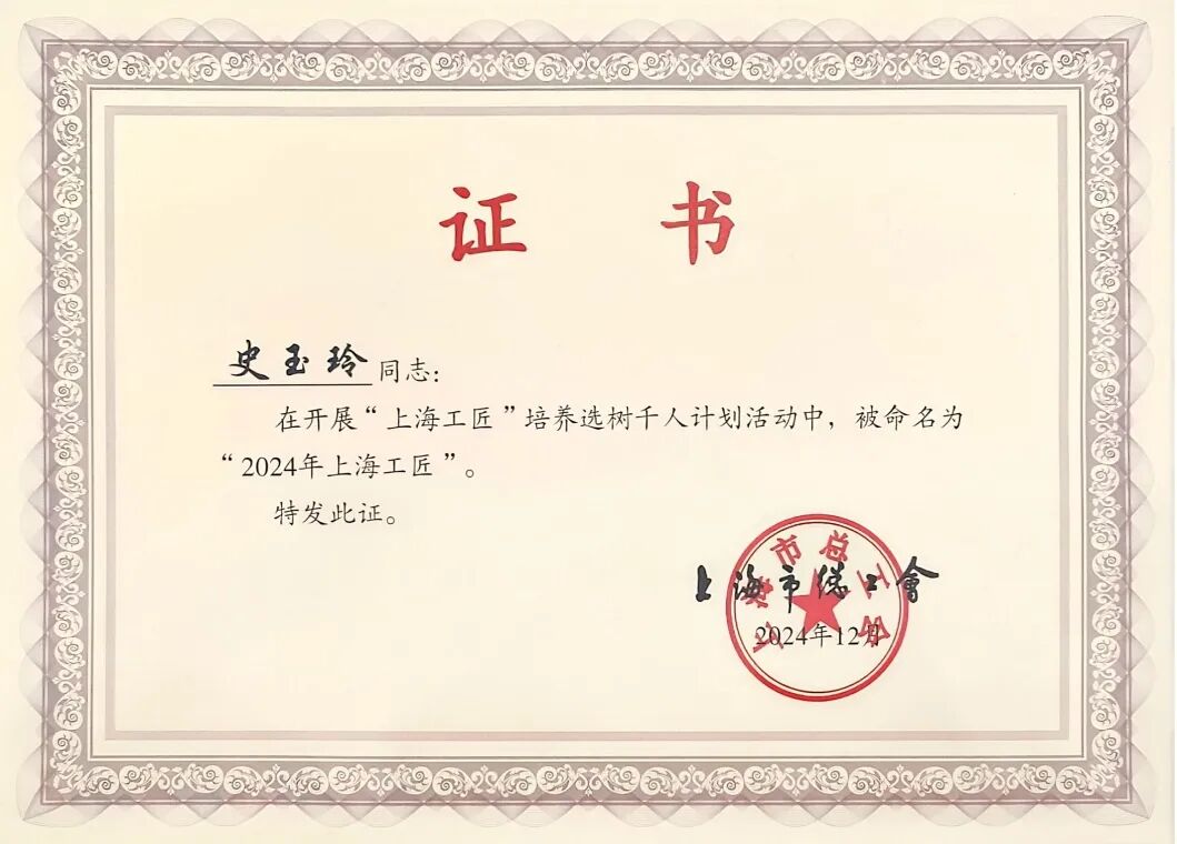 近日,2024年“上海工匠”评选结果正式揭晓。经资格审查、海选面试、专家初审、评审发布以及市总工会审定等多个环节,最终评选出108名最能代表“上海工匠”精神的行业精英。我院副院长史玉玲教授凭借卓越的专业能力和敬业精神,成功入选并荣获“上海工匠”荣誉称号,特此祝贺!