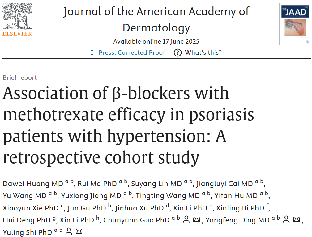 上海市皮肤病医院/同济大学附属皮肤病医院史玉玲教授课题组在《Journal of the American Academy of Dermatology》期刊(IF=12.8)上发表题为“Association of β-blockers with methotrexate efficacy in psoriasis patients with hypertension: A retrospective cohort study”的简要报告,该研究利用回顾性队列研究的设计,尝试探究β受体阻滞剂对银屑病治疗的影响。