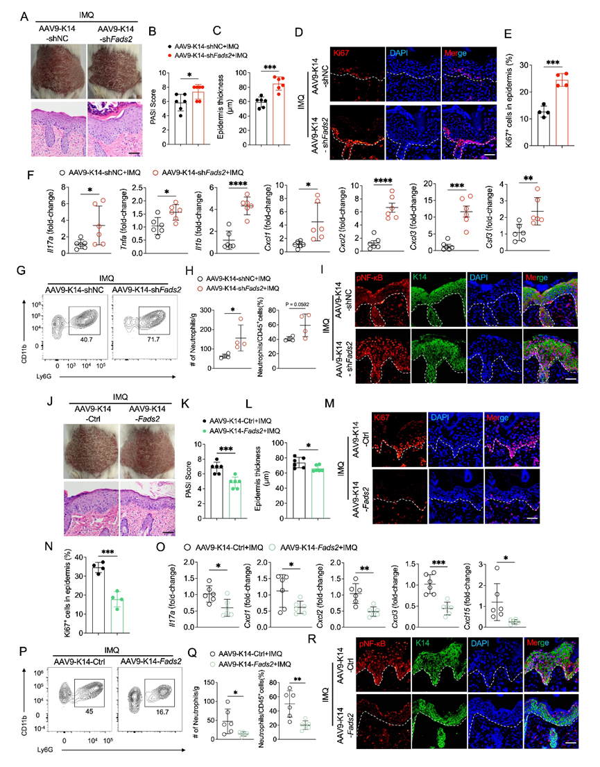 研究团队进一步通过AAV9-K14递送系统,在角质形成细胞中实现对FADS2的特异性调控。结果表明,沉默FADS2可显著加重小鼠银屑病样炎症,表现为表皮增厚、角质形成细胞异常增殖加剧,以及炎症因子和中性粒细胞趋化因子的上调;而在角质形成细胞中过表达 FADS2则能够显著减轻银屑病样炎症表型(图1)。