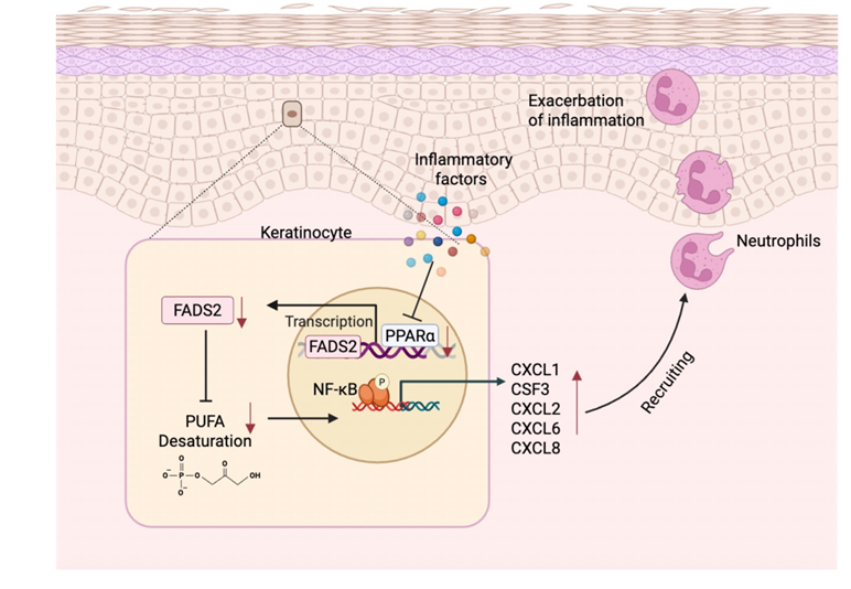 银屑病是一种常见且易复发的慢性炎症性皮肤病,全球患病率约2–3%,我国患者人数超过1000万,不仅严重影响患者的身心健康,也带来沉重的社会经济负担。尽管当前已有包括生物制剂在内的免疫抑制治疗手段,但其存在成本高、副作用明显、疗效衰减和复发等问题,迫切需要开发机制明确、靶点新颖、兼具安全性和实用性的治疗策略。近年来,皮肤局部代谢异常尤其是脂肪酸代谢紊乱被逐步认为是银屑病等炎症性皮肤病发生发展的重要因素。然而,在银屑病中其关键代谢酶及上游调控机制尚未明确。